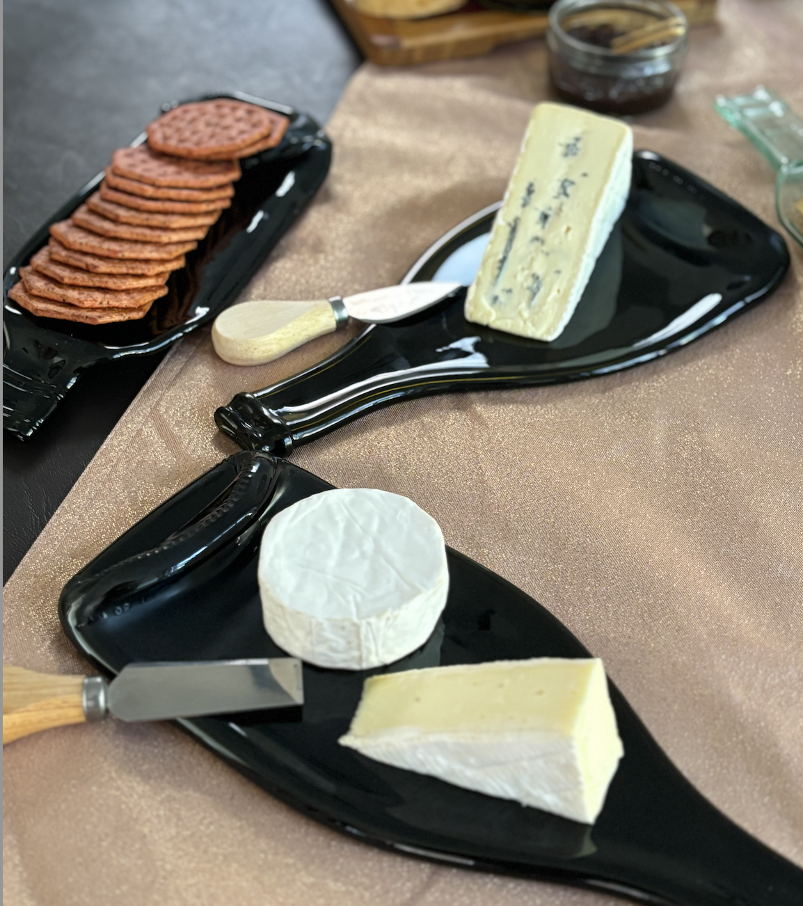 A sparkling wine bottle which has been slumped in the kiln for 12 hours to create a flat cheeseboard.